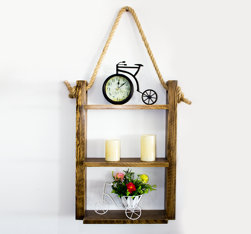 Pour s’accommoder à votre intérieur au look campagnard chic, optez pour cette décoration murale en bois clair à 3 étagères qui se suspend à l’aide d’une corde.