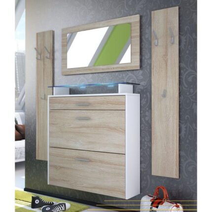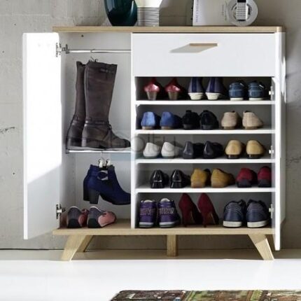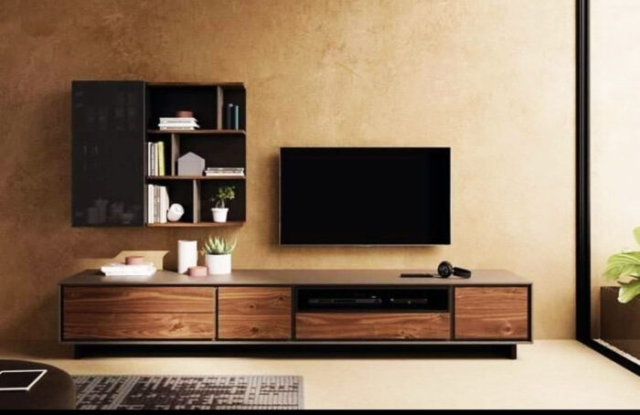 Parfait pour un style de décor bohème et raffiné, le meuble TV Bolzano est en bois. Il mèle un style raffiné avec quelques touches factory. Il comprend notamment en bas, 3 tiroirs larges, deux tiroirs carrés ainsi qu’un creux à rangement pour immiscer un lecteur DVD ou autre. Il est aussi accompagné par un élément mural comprenant des étagères design ainsi qu’un volet à porte battante transparent en verre.