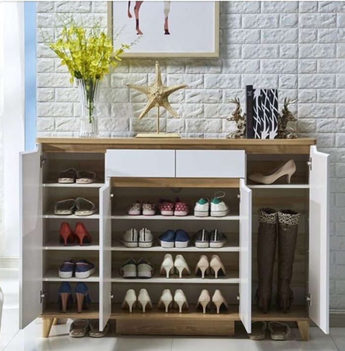 Votre rêve a toujours été de trouver le meuble qui comportera toutes vos paires ? Le porte-chaussures Rimini a été conçu pour le réaliser ! Ce dernier comprend 3 volets, deux en longueur comprenant des étagères ainsi qu’un en largeur ayant une grande capacité. Il dispose aussi de deux tiroirs.